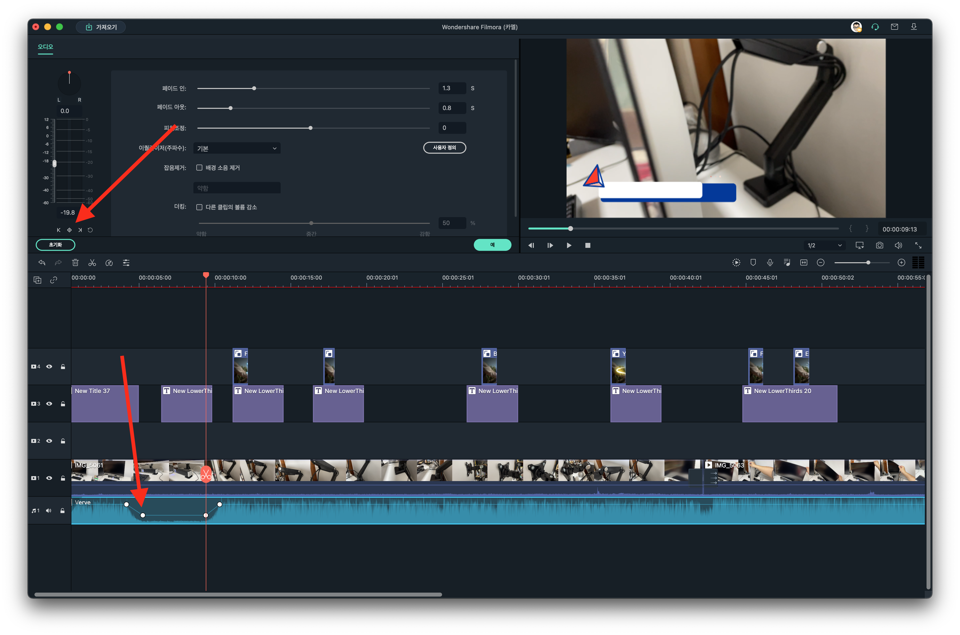 아래 쪽 빨간 화살표가 가리키는 곳을 보면 키프레임을 사용해 일부 구간만 음악 소리를 줄인 것을 볼 수 있습니다.