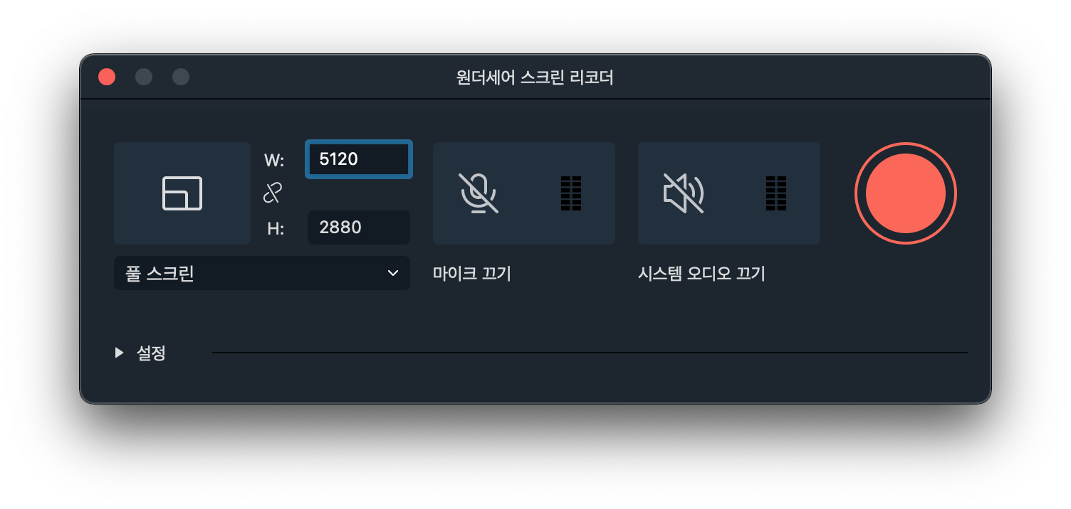 녹화 관련 설정을 할 수 있는데요, 풀 스크린 화면을 그대로 녹화할 수도 있고