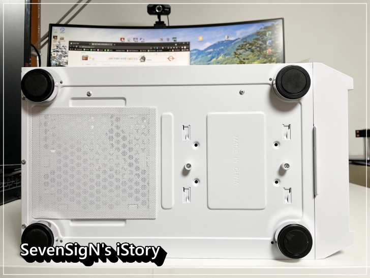아래쪽도 한번 볼까요? 왼쪽으로는 파워서플라이의 팬과 연결되는 마그넷 먼지필터가 있습니다. 그리고 오른쪽엔 2개의 나사가 있는데 내부의 HDD 트레이를 고정하고 있는 나사죠. 충분히 안정적으로 보이는 고무패드는 케이스의 진동을 잡아주는 역할을 합니다.