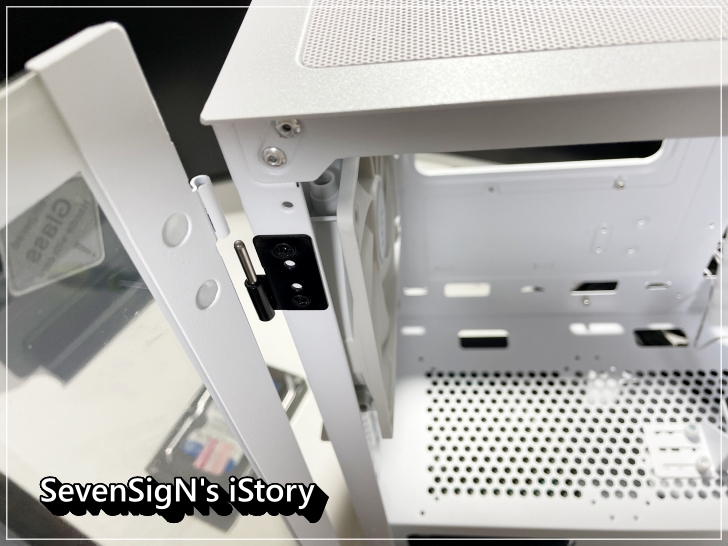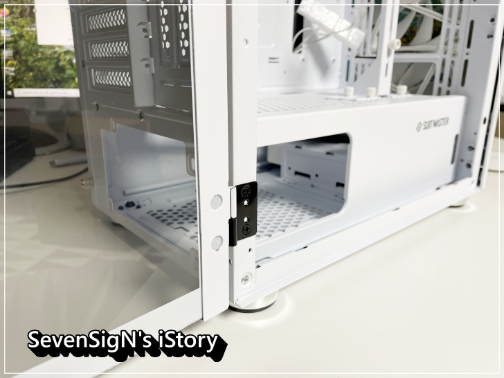 그리고 또 앱코 SUITMASTER P1000 강화유리(화이트) 케이스에서 마음에 드는 점, 바로 도어형 좌측판입니다. 강화유리로 되어있는 좌측판인데 기존에 제가 써본 케이스들과 달리 열고 닫을 수 있어서 불편하게 나사를 돌려 여닫을 필요가 없더라구요.