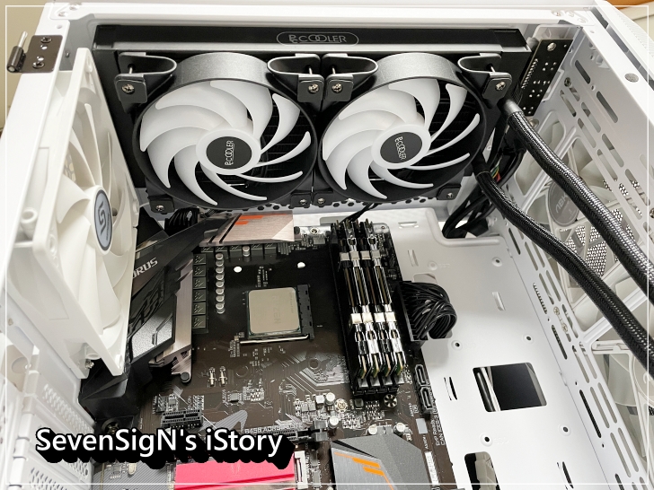 상단에는 수랭쿨러를 연결해주었습니다. 수랭쿨러는 상단에는 최대 240mm, 전면에는 최대 360mm 까지 장착이 가능합니다.
