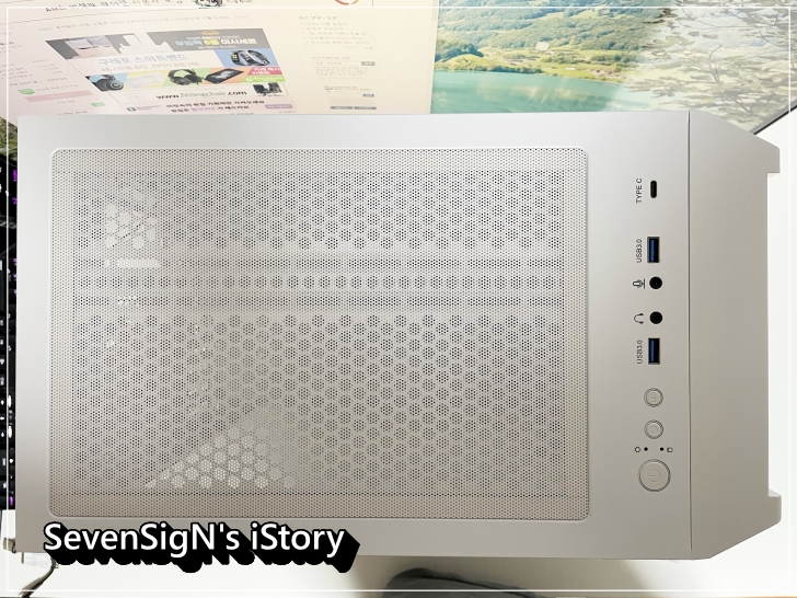 상단과 하단에도 마그넷 타임의 탈착식 먼지 필터가 있어서 사용하다가 쉽게 세척할 수 있어서 좋습니다. 그리고 상단에 전원버튼 등 각종 버튼과 포트가 있어서 본체를 책상 아래에 내려두고 사용하시는 분들이 특히 이용하기 편합니다. 전원버튼, 리셋버튼, LED 버튼, USB 3.0, MIC, Audio 포트가 있고, USB-C 포트까지 지원을 하고 있어서 C타입을 지원하는 메인보드를 사용하는 분들의 경우엔 활용도가 더 높습니다. 아쉽지만 제 보드는 지원을 안해서..ㅎ