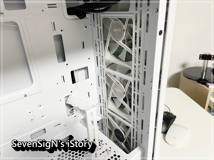 전면부에도 역시 Airflow Type 140mm 팬 3개가 기본으로 장착되어 있는데요, 앱코 SUITMASTER P1000 강화유리(화이트) 케이스의 팬은 LED 팬은 아닙니다. RGB 감성 원하시는 분들은 교체해주시면 되구요.
