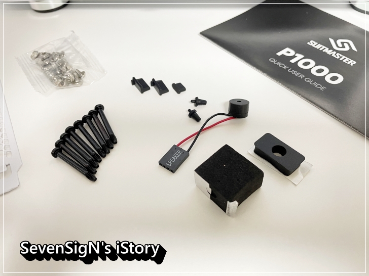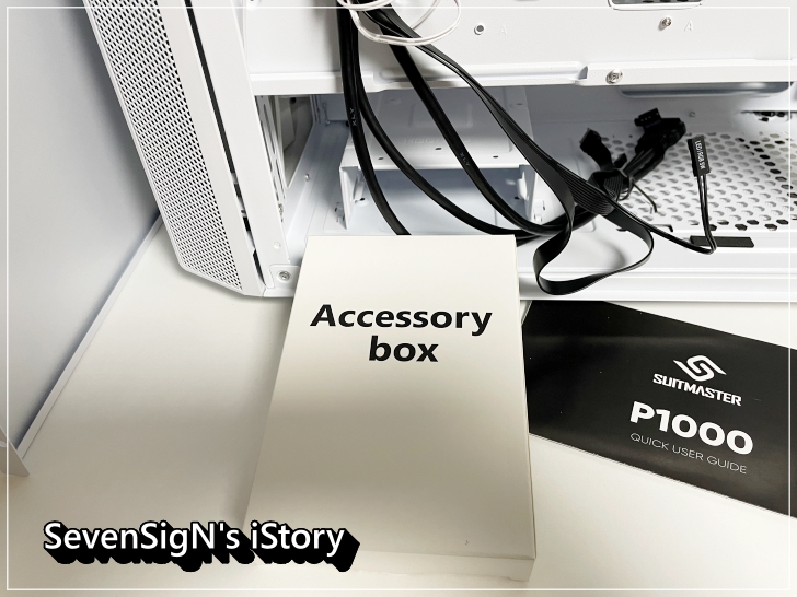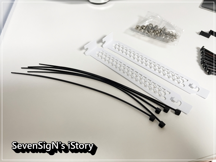 악세사리 박스에는 케이블 타이와 슬롯 가이드 및 나사들, 메인보드 비프음용 스피커 등이 포함되어 있습니다.