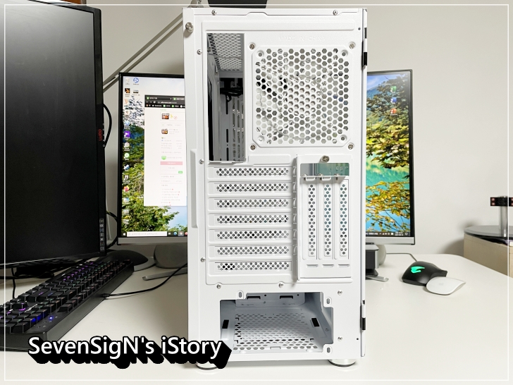 그리고 앱코 SUITMASTER P1000 강화유리(화이트) 케이스는 뒷면에서 보면 그 차이가 좀 더 나지만 일반적인 미들타워 케이스보다 폭이 여유로운 것을 알 수 있는데요, 보시면 아시겠지만 바로 그래픽카드를 세울 수 있는 수직 PCI 슬롯이 있습니다. 전 아직 그래픽카드를 세워본 적은 없는 조만간 한번 세워보려고 합니다 ㅎ 일반적인 PCI 슬롯은 7개가 제공됩니다. 후면 상단에는 Airflow Type 140mm 팬이 장착되어 있습니다.