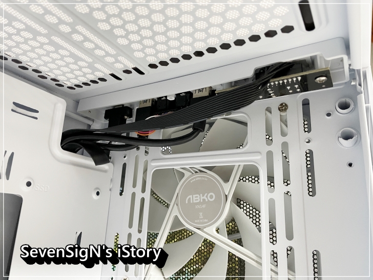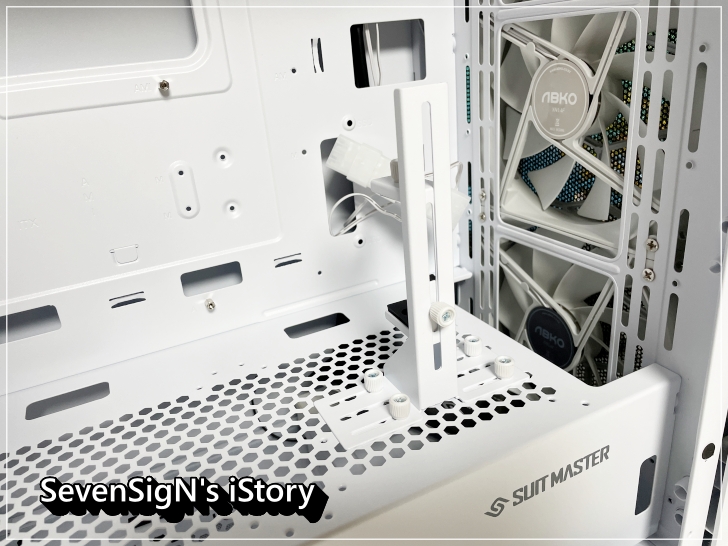 측면을 보니 여유로운 공간이 눈에 들어옵니다. 그리고 또하나 눈에 들어오는 것이 바로 그래픽지지대입니다. 앱코 SUITMASTER P1000 강화유리(화이트) 케이스에는 그래픽 지지대가 기본적으로 포함되어 있어서 그래픽 카드를 안정적으로 설치할 수 있습니다. 메인보드는 ATX까지 장착이 가능하고, 그래픽카드 지지대 우측 안쪽을 보면 위 아래로 2.5인치 SSD를 장착할 수 있는 조립부가 2개 마련되어 있습니다.