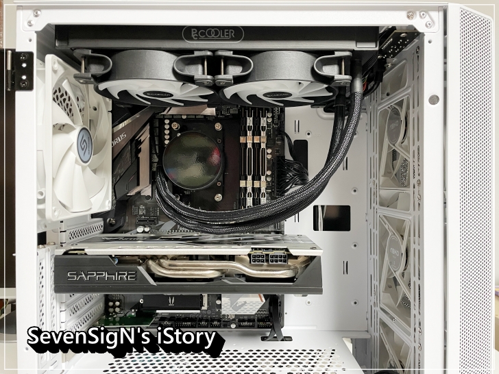 상단에는 수랭쿨러를 연결해주었습니다. 수랭쿨러는 상단에는 최대 240mm, 전면에는 최대 360mm 까지 장착이 가능합니다.