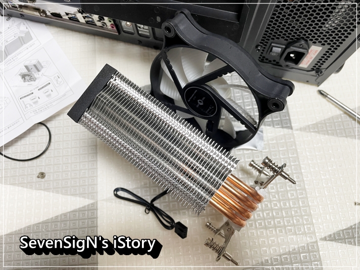 그리고 리드쿨 POONG AC-2100 RAINBOW CPU 쿨러에 인텔용 브라켓을 고정시켜줍니다. 장착 후에 스티커는 제거해주세요. 꼭이요~ 그리고 보시다시피 구리 히트파이프가 4개 장착되어 있는 걸 알 수 있습니다.