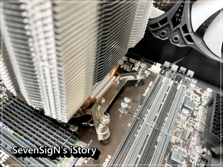 메인보드에 쿨러를 고정하기 전에 일단 팬은 분리를 해주어야 합니다. 그래야 브라켓나사를 돌려서 고정시킬 수 있거든요.