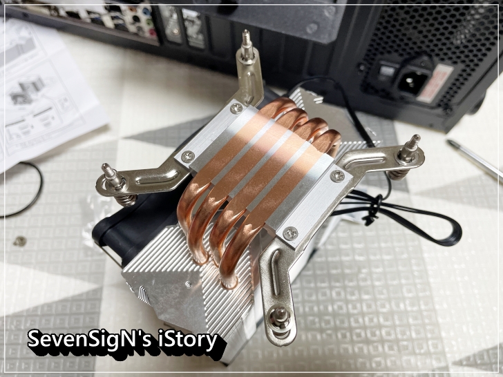그리고 리드쿨 POONG AC-2100 RAINBOW CPU 쿨러에 인텔용 브라켓을 고정시켜줍니다. 장착 후에 스티커는 제거해주세요. 꼭이요~ 그리고 보시다시피 구리 히트파이프가 4개 장착되어 있는 걸 알 수 있습니다.