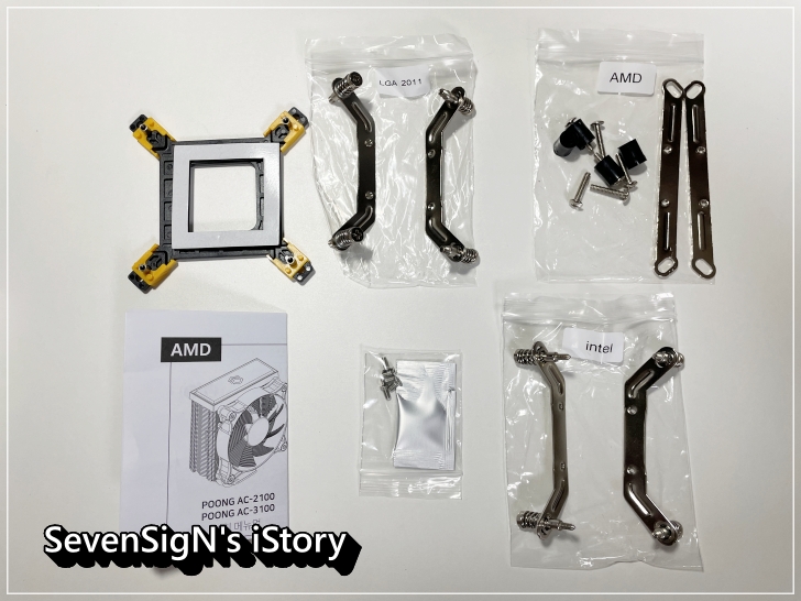 구성품입니다. 백플레이트와 고정용 양면테이프, 그리고 인텔용 브라켓이 있습니다. 인텔용은 LGA2011용을 함께 제공합니다. AMD용은 무뽑기 방지키트가 포함되어 있어서 혹시나 발생할 수 있는 불상사를 예방할 수 있습니다.