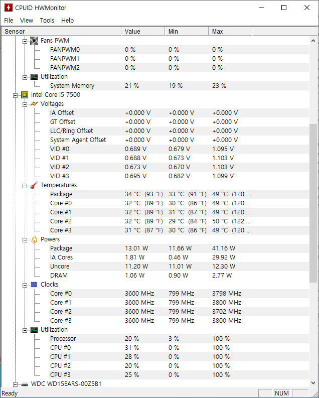 온도를 한번 재봐야겠죠? 기존 장착 쿨러가 기쿨이 아니라 기본 쿨러와의 비교는 안했지만 참고용으로 봐주시면 될 것 같습니다. HWP Info와 CPUID HWMonitor 에서 확인해봤습니다. 별작업이 없는 상태이긴 하지만 괜찮은 것 같네요. 리드쿨 POONG AC-2100 RAINBOW CPU 쿨러는 PWM을 지원하기 때문에 CPU 온도에 따라 최저 900RPM에서 최고 1,800RPM의 속도로 조절이 됩니다.
