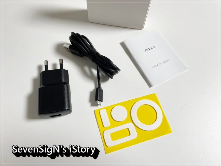 스마트 홈 장비를 보기전에 부속품 먼저 살펴볼까요. 충전어댑터와 충전용 마이크로 5핀 케이블, 그리고 설명서와 장치별 양면테이프가 있습니다.