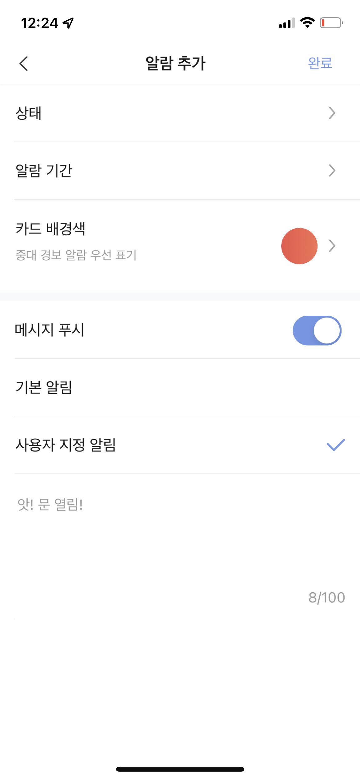 사용자 지정 알림 메시지를 직접 입력할 수가 있더라구요. '앗! 문 열림!'이라고 입력해봤는데요,