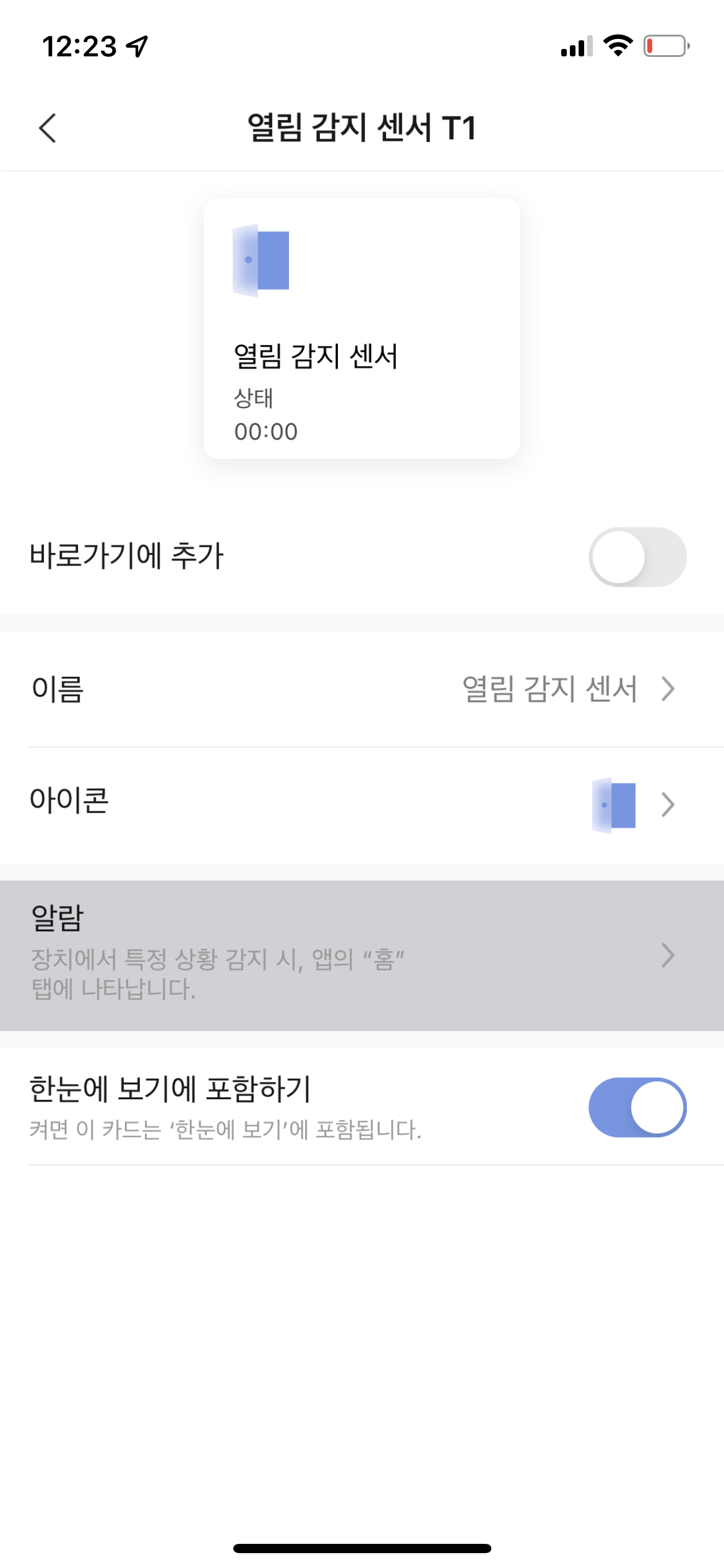 Aqara Home 앱에서 열림 감지 센서를 누르면 이렇게 알람도 설정할 수가 있습니다.