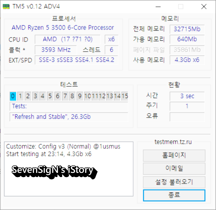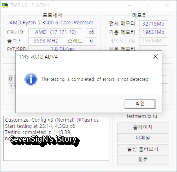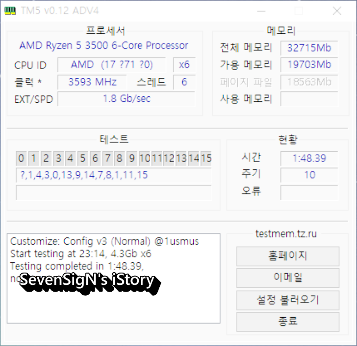 | 메모리 테스트 프로그램으로 알려진 TM5로 테스트해봤는데 10주기 에러 하나 없이 완료되었습니다.