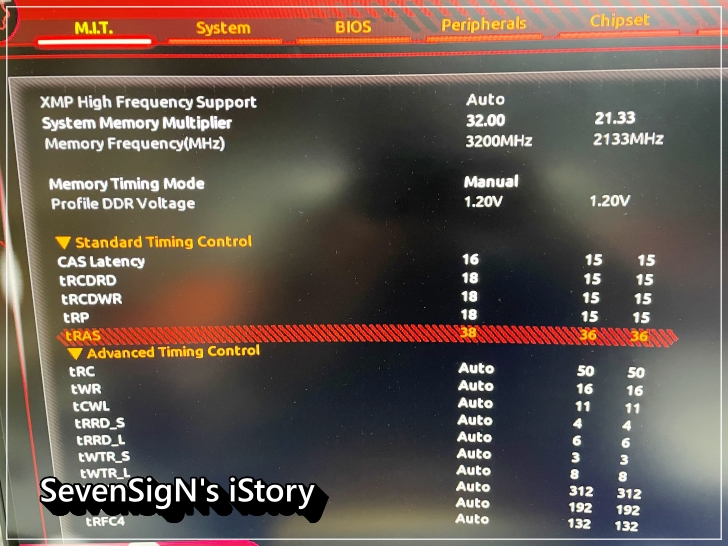 | 이걸 다음과 같이 바꿔줘봤습니다. Memory Frequency 3200이 국민오버라고 하는 것 같은데 그만큼 엔간하면 된다는 얘기겠죠? 암튼 Memory Frequecy를 3200으로 변경하고 Standard Timing Control은 16 18 18 18 38로 변경을 해주었습니다.