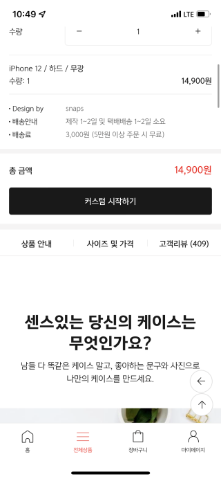 나만의 폰케이스는 커스텀 시작하기를 누르면 디자인을 시작할 수 있습니다.