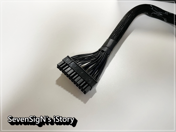 | 그럼 지금부터는 맥스엘리트 MAXWELL GAMING PRO 700W 파워의 케이블 구성에 대해서 한번 살펴보겠습니다. 우선 메인보드 전원 공급용 20+4pin 케이블입니다. 4핀은 자유롭게 분리가 가능하고 케이블은 깔끔하게 정리되어 있습니다.