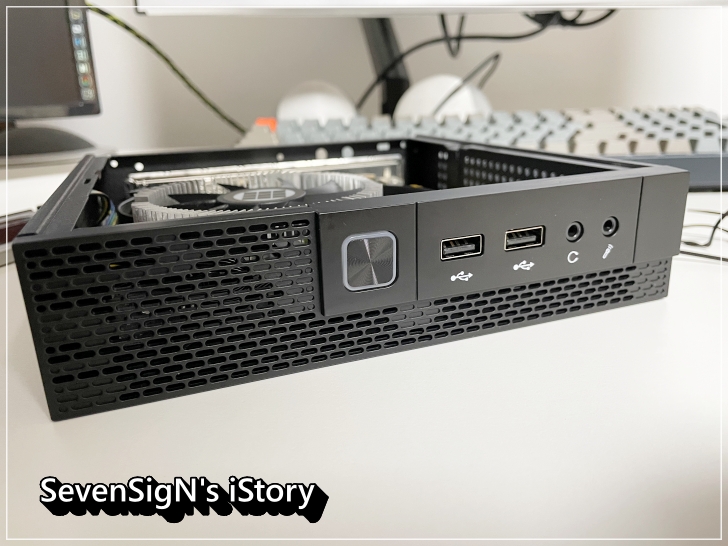 | 케이스 앞 부분인데요, 전원버튼외에 USB 2.0 포트 2개와 마이크/이어폰 단자가 있습니다. 꽤 맘에 들더라구요. 슬림하면서 메인보드의 쿨러 높이도 딱 맞구요~