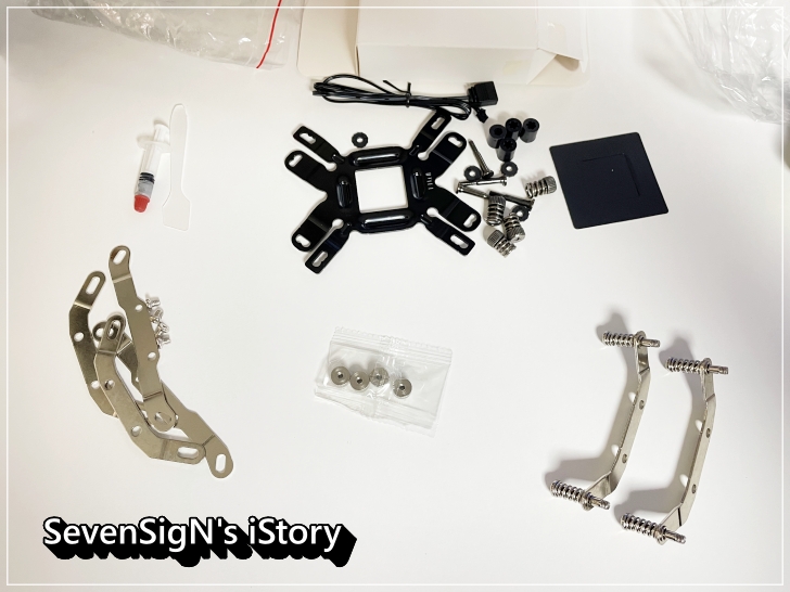 | 장착 부속품입니다. 인텔과 AMD CPU 모두 지원하는 부품으로 구성이 되어있고, 써멀구리스도 포함되어 있네요. AMD CPU 사용하는 사람들을 위한 무뽑 방지 브라켓과 스크류도 있어서 좋네요.