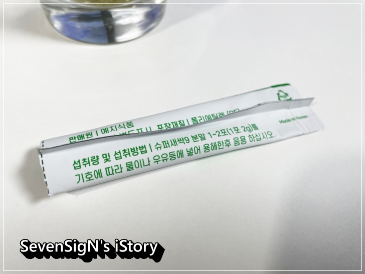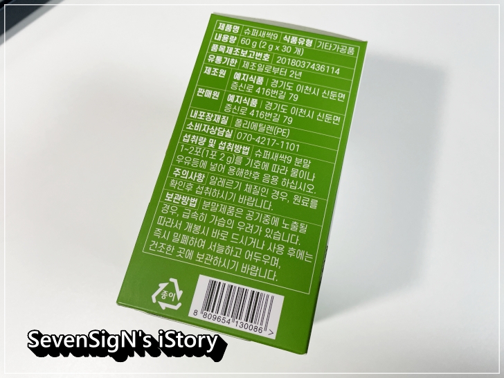 슈퍼새싹9은 한 상자에 2g짜리 개별포장으로 30개가 들어있습니다.