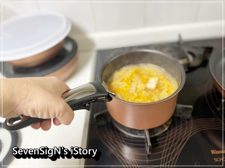 맛있게 다 끓인 편수냄비의 배춧국은 역시나 테팔 매직핸즈를 사용해서 식탁으로~