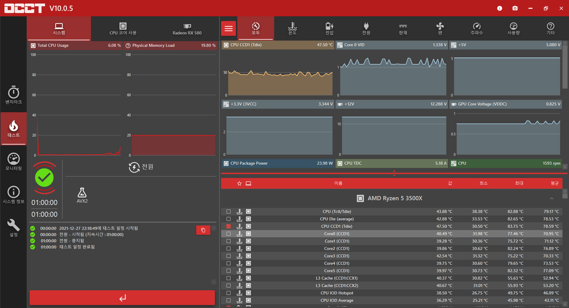 | 잘만 MegaMax 600W 80PLUS STANDARD 파워 장착 후 잘 알려진 테스트 프로그램 OCCT를 돌려봤습니다. 1시간 구동해봤는데 특이할만 내용은 없었던 것 같네요. 안정적으로 시스템에 전원을 공급해주는 것 같아 잘 사용할 것 같습니다.