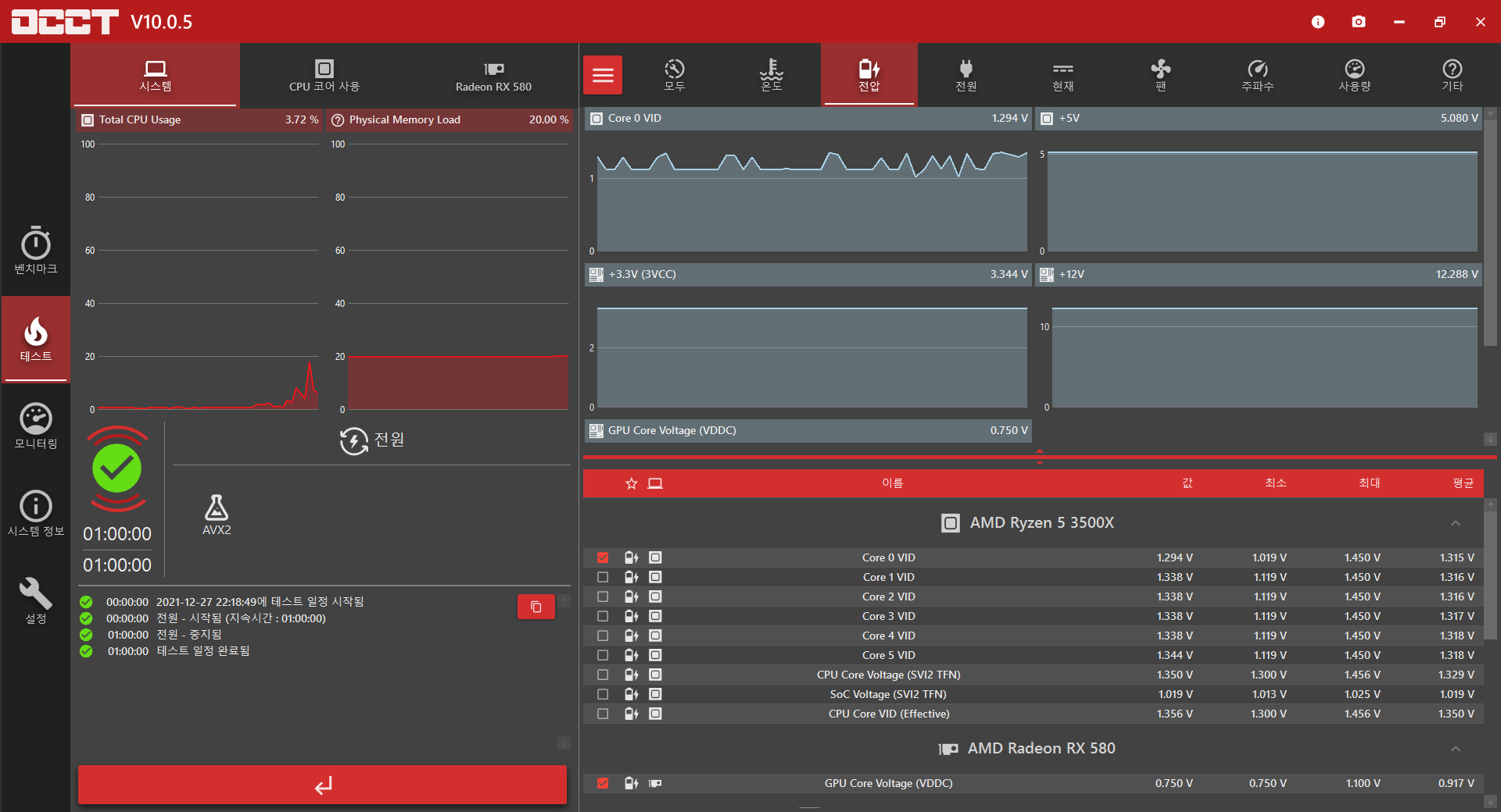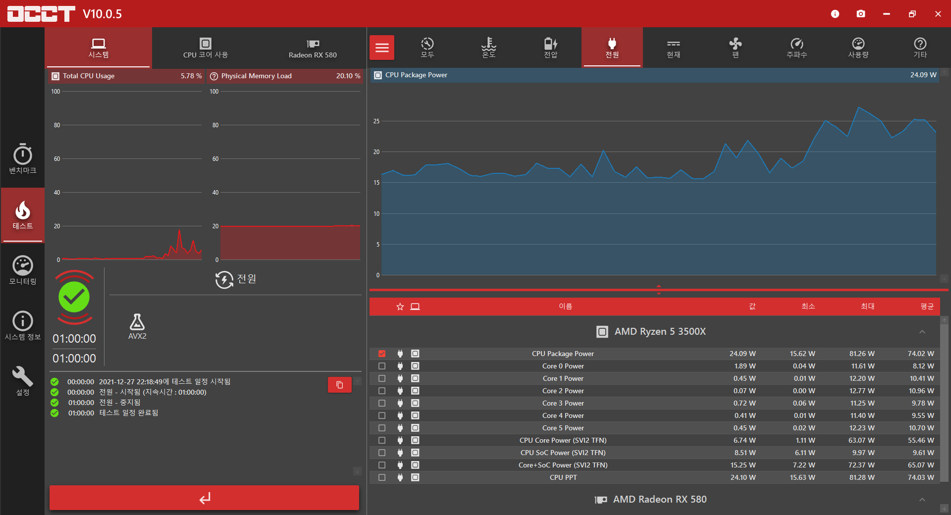 | 잘만 MegaMax 600W 80PLUS STANDARD 파워 장착 후 잘 알려진 테스트 프로그램 OCCT를 돌려봤습니다. 1시간 구동해봤는데 특이할만 내용은 없었던 것 같네요. 안정적으로 시스템에 전원을 공급해주는 것 같아 잘 사용할 것 같습니다.