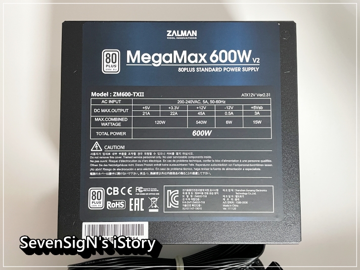| 잘만 MegaMax 600W 80PLUS STANDARD 파워에도 제품명과 박스에 표시되어 있던 파워 사양이 부착되어 있는 걸 확인할 수 있습니다.