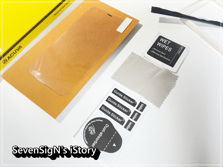 | 부착을 위한 알콜솜, 먼지제거용 스티커, 가이드 스티커, 그리고 액정닦이용 천이 포함되어 있습니다.