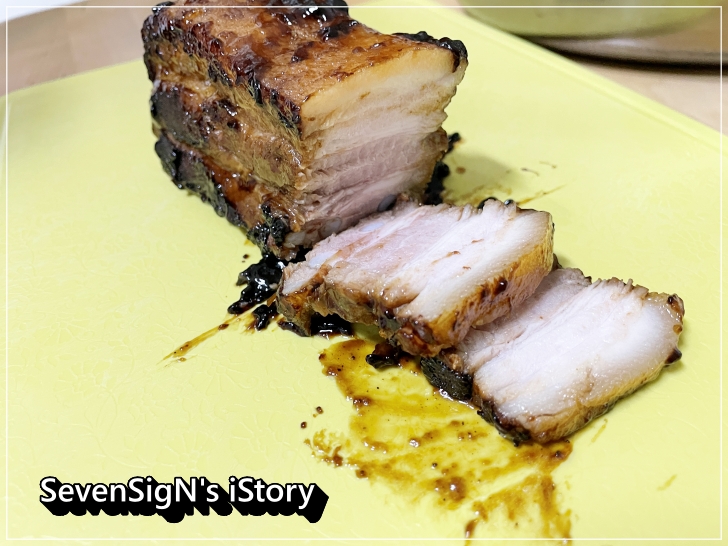 두툼한 고기를 잘 익혀서 잘라봤는데, 둘러싸고 있는 양념 덕분인지