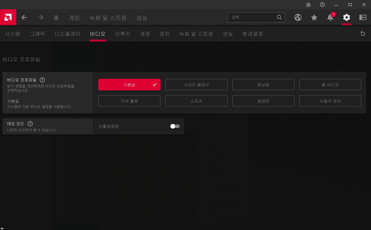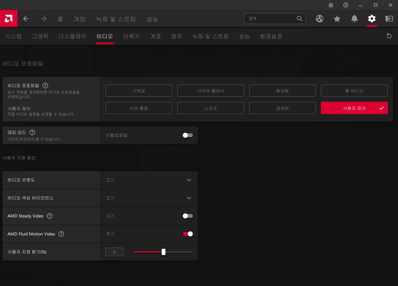 | 그리고 다시 AMD 설정 화면의 비디오 메뉴를 확인해보면 사용자 지정 옵션과 함께 'AMD Fluid Motion Video' 항목이 생긴 것을 알 수 있습니다. 그리고 이제는 동영상 플레이어에서 플루이드모션 설정을 해주면 됩니다.