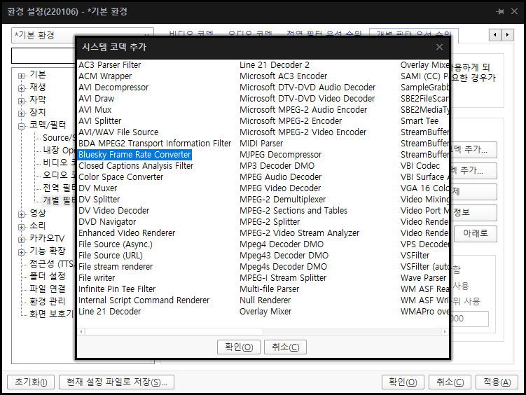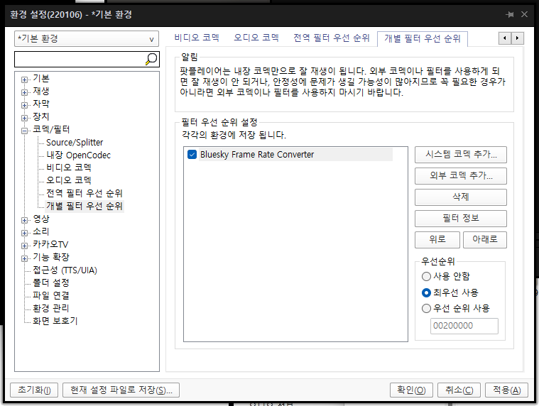 | 그리고 나서 추가된 'Bluesky Frame Rate Converter'를 선택하고 우선순위를 최우선사용으로 클릭하고 '확인'을 클릭하면 됩니다.