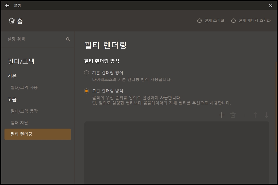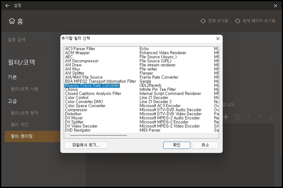 | 필터 렌더링의 고급 렌더링 방식을 선택하고 +를 누른 후 열린 팝업에서 'Bluesky Frame Rate Converter'를 선택합니다.