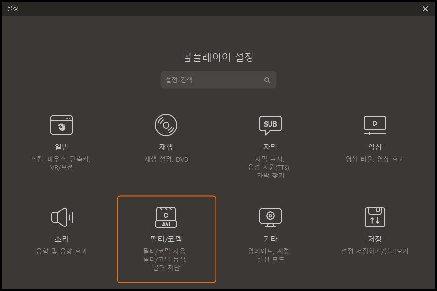 | 먼저 곰플레이어 설정입니다. 설정에서 필터/코덱을 선택합니다.