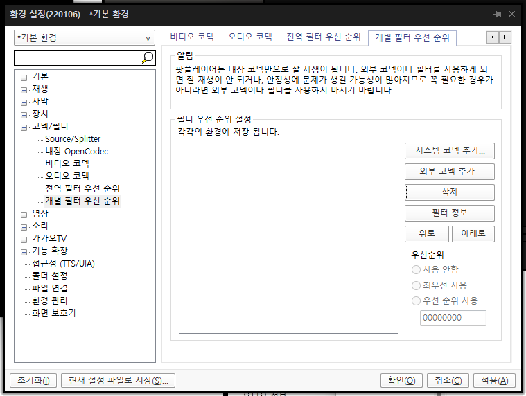 | 팟플레이어입니다. 환경설정에서 코덱/필터의 '개별 필터 우선 순위'를 선택합니다. 그리고 '시스템 코덱 추가'를 클릭합니다.