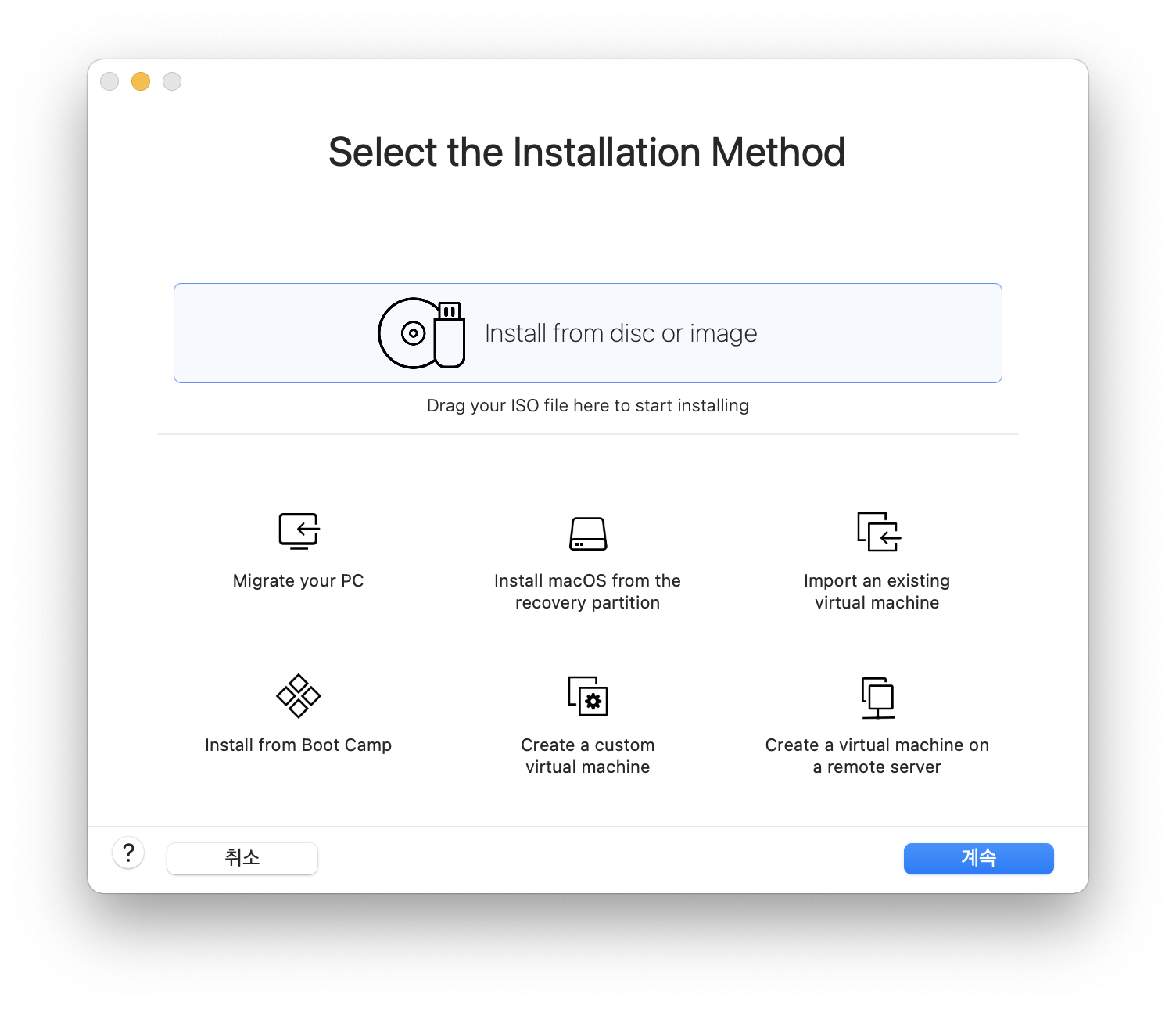 | 아래 화면에서 맨 위에 보이는 'Install from disc or image'를 눌러 윈도우 10 설치를 시작합니다. 가상 환경 설치 관련 다양한 옵션이 있으니 참고하시면 됩니다. 가장 일반적인게 설치 이미지로 설치를 하는거죠.