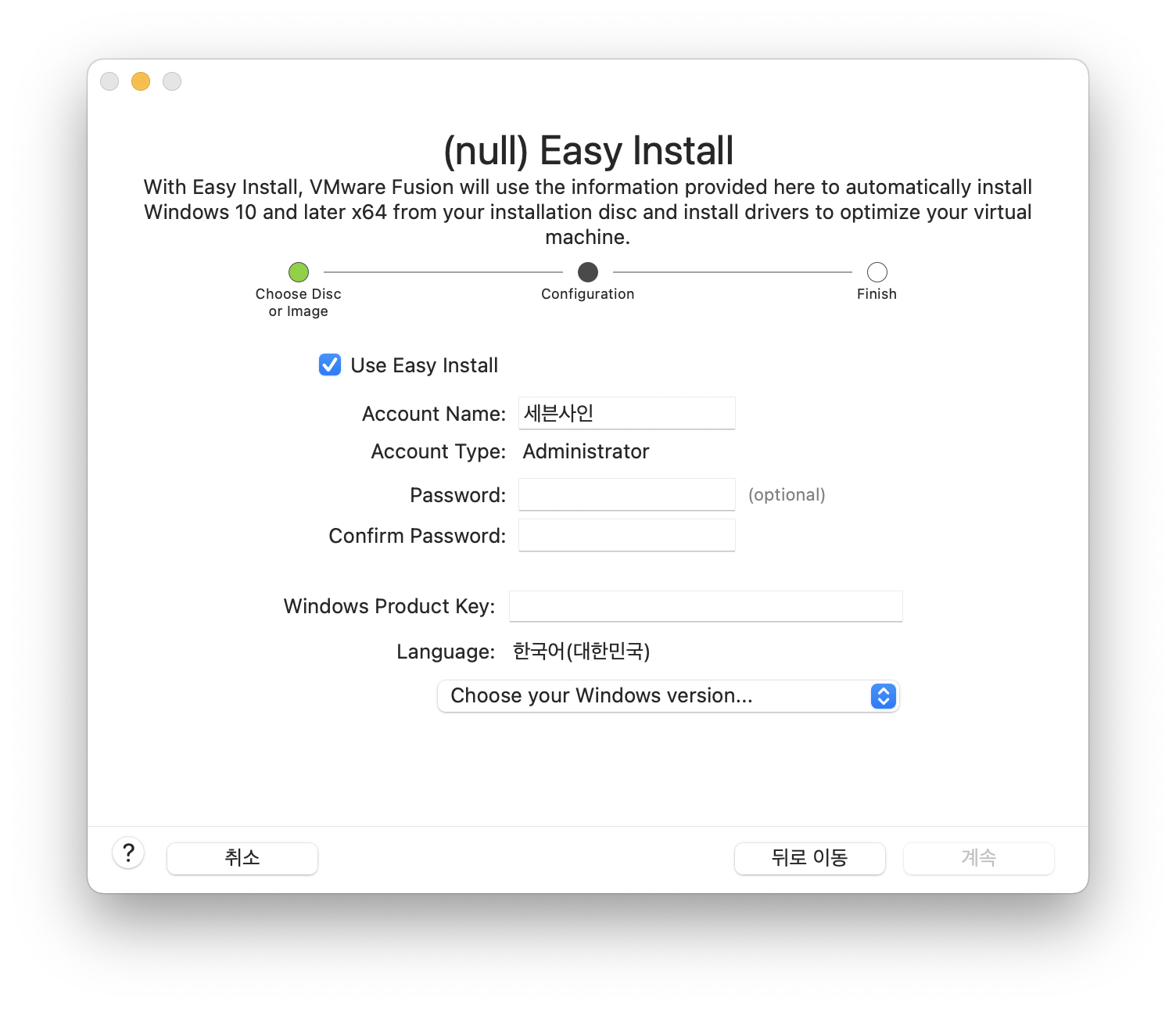 | 윈도우 설치 관련 계정명과 비밀번호를 입력해주고, 윈도우 등록키도 있다면 여기서 넣어줄 수 있습니다. 없어도 설치는 가능합니다. 그리고 아래쪽에 있는 리스트에서 설치할 윈도우 버전을 선택하고 계속 진행합니다.