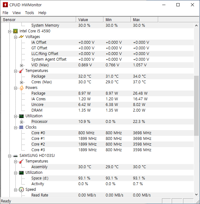 | HWMonitor로 기본 쿨러 상태를 확인해보니 35도에서 37정도가 나오더라구요. 부팅 후 아이들 상태의 온도입니다.