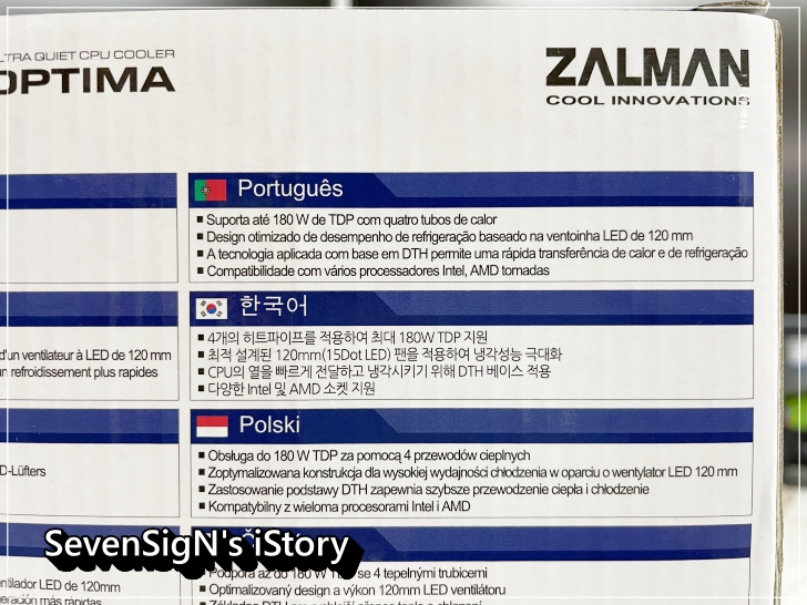| 패키지에는 잘만 CNPS9X OPTIMA White LED CPU쿨러의 몇가지 특징이 표시되어 있습니다.