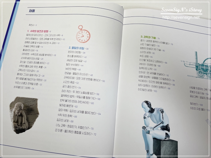 '수학의 발견과 발명', '물질의 비밀', '과학의 기술'에 대해서 다루고 있습니다.