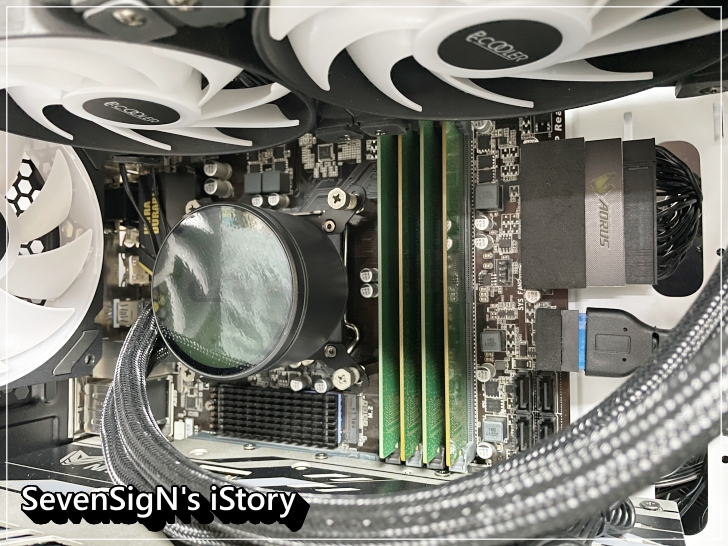 | 상단에 2열 수냉쿨러장착이 되는 것 까진 좋았는데, 아쉬운 점이 있다면 메모리에 LED튜닝 방열팬을 설치하면 간섭이 생겨 메모리 설치가 어렵더라구요. 그래서 기본 시금치 상태로 설치할 수 밖에 었었거든요. 좀 더 공간이 나왔으면 하는 아쉬움이 있네요 ㅎ
