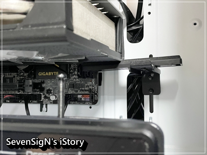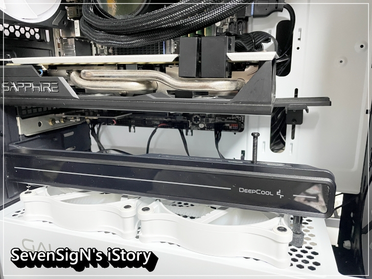 | 아래 사진을 보시면 딥쿨 그래픽 지지대가 제대로 기능을 할 수 없는 걸 보실 수 있는데요, 이건 제 시스템 구성상 이럴 수 밖에 없는거라 케이스의 문제는 아닙니다. 그래픽 카드 바로 아래에 랜카드를 설치해야 해서 그래픽 지지대를 위치를 조정할 수 밖에 없었거든요 ㅎ