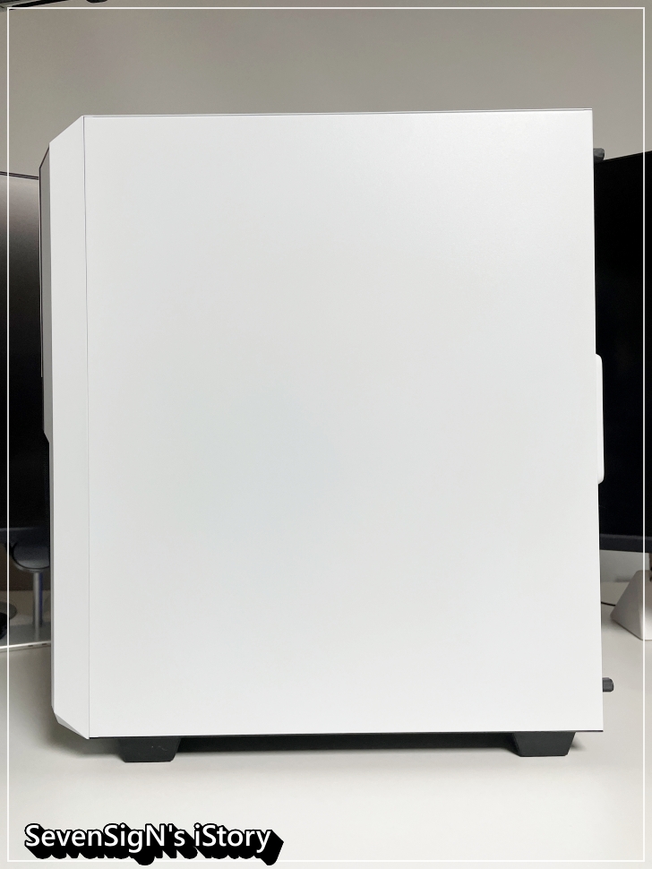 | 도어형 측면 강화유리 패널이라 쉽게 열고 닫을 수 있습니다. 측면 패널 테두리는 블랙으로 되어 있는데요, 이 부분까지 올 화이트면 어땠을까 하는 생각도 해봅니다. 컴퓨터 조립을 위한 부품이 케이스 안에 있으니 개봉 후 꼭 확인해보세요.