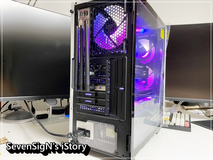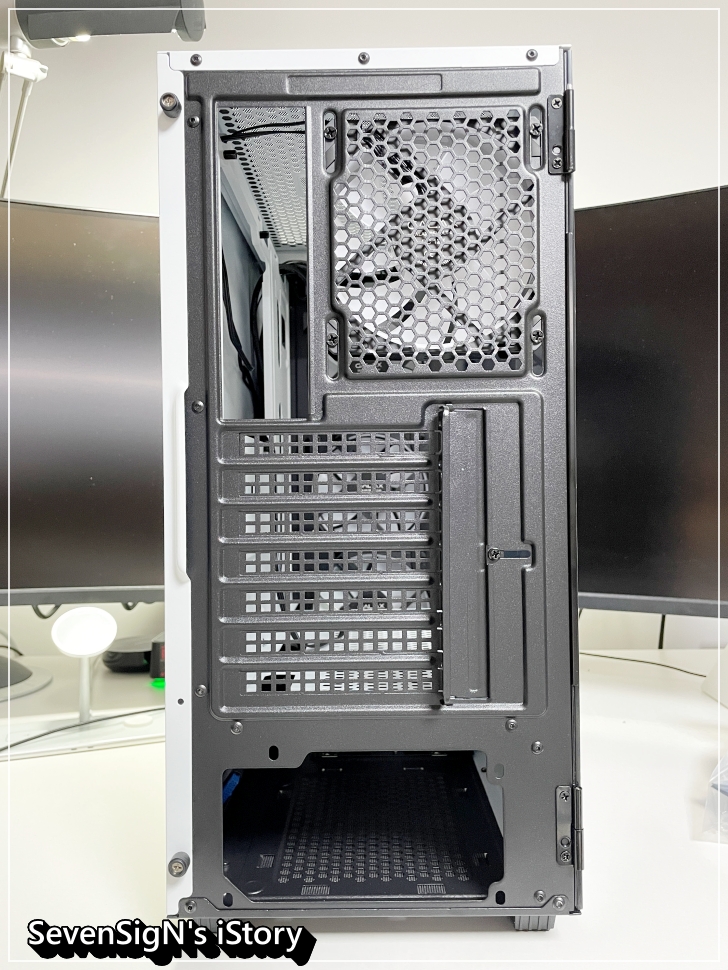 | 뒷면입니다. 기본적으로 장착되어 있는 배기용 LED팬이 보이고, 메인보드 패널 공간과 7개의 슬롯이 보이네요. 슬롯커버는 제거하는 타입이라 처음 조립할 때 딱 필요한 슬롯만 제거하는게 좋겠죠? ㅎ