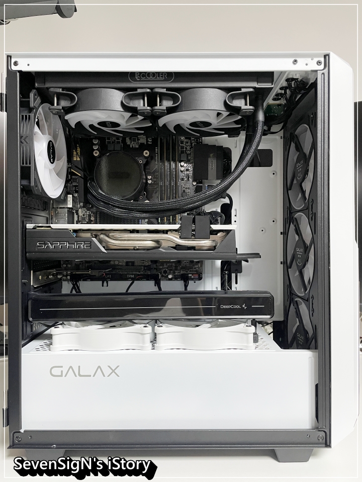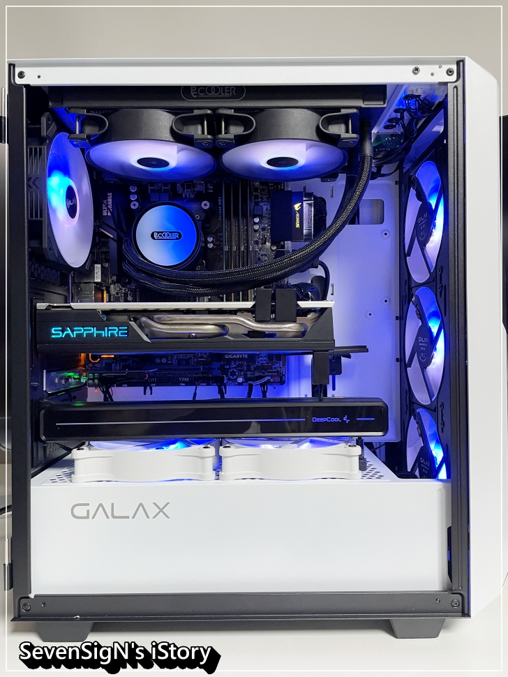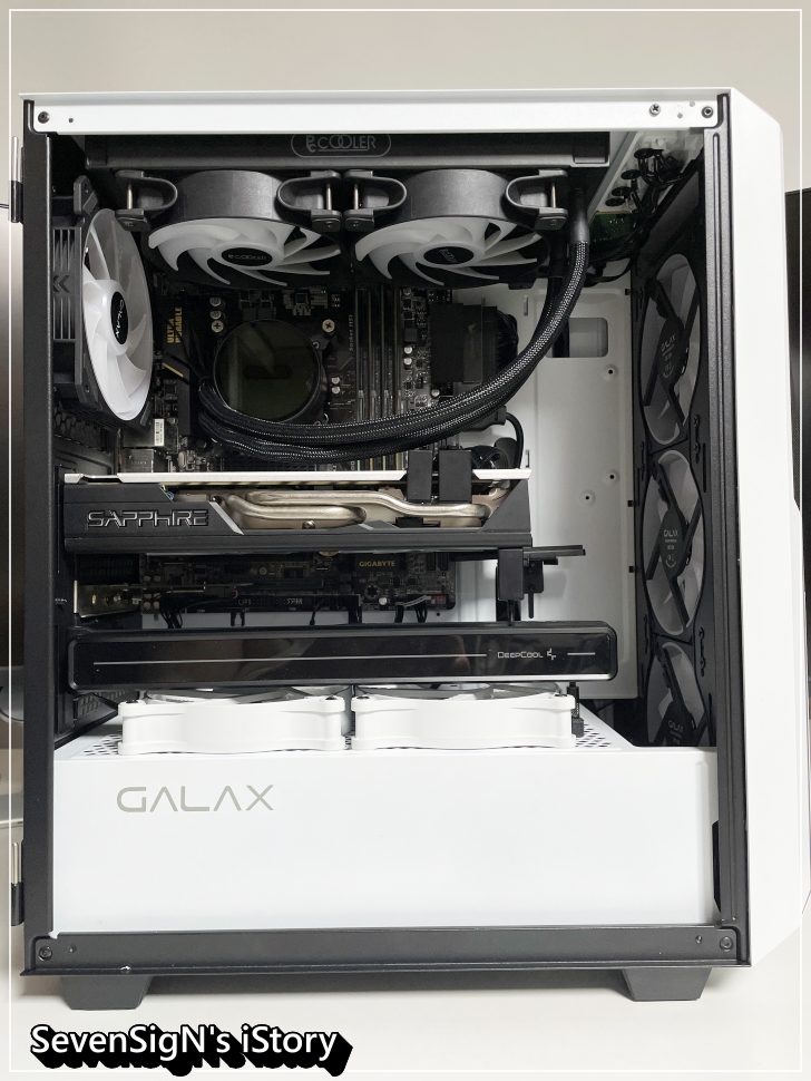 카비레이크 i5-7600 시스템인데요, 4기가 4개로 풀뱅크를 만들고, 파워/그래픽카드 전원 젠더에, 별도의 딥쿨 그래픽카드 지지대까지 달아주고 ㅋ 아래쪽에도 2개의 LED팬을 설치해주었습니다.