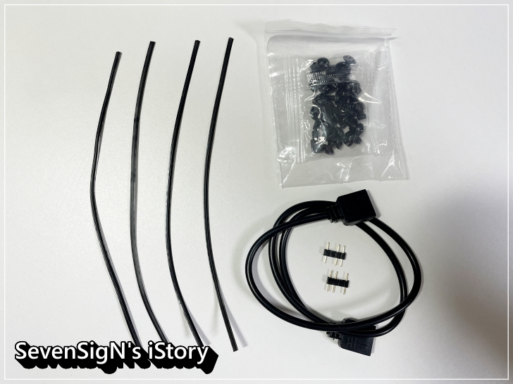 | 케이스 안에 들어있던 조립부품들을 보자면 케이블타이 4개, 나사들, 그리고 여분의 ARGB 케이블이 1개 포함되어 있습니다. 양방향 모두 사용할 수 있도록 젠더도 포함이 되어 있구요.