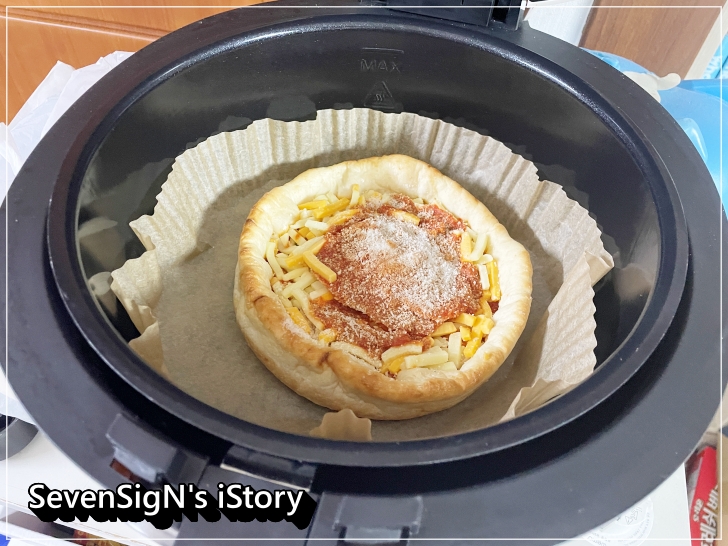 에어 프라이어에 종이를 깔아주고 두툼한 피자를 잘 올려줍니다.