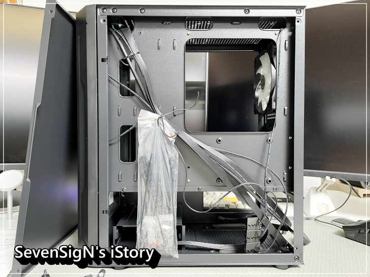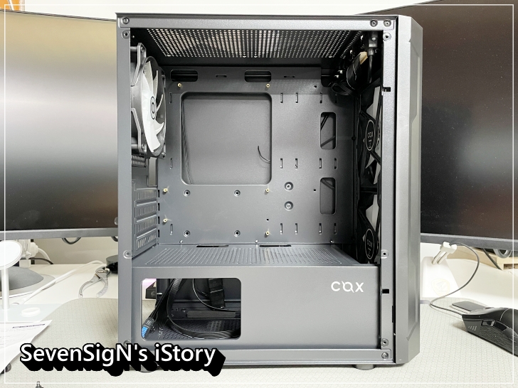 | M-ATX 사이즈의 메인보드까지 딱 들어갈 사이즈 입니다. 상단 수냉 쿨러를 설치하긴 무리가 있는 사이즈이고, 공랭쿨러도 경우에 따라 제한적일 수 있습니다. 역시 아래에서 보시면 되구요. 팬은 전면에 LED 팬 2개, 후면 LED 팬 1개가 기본장착되어 있습니다.
